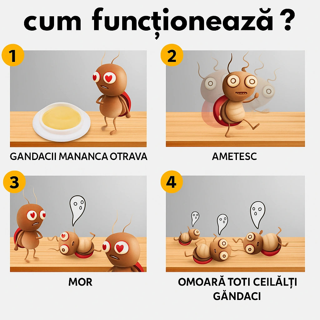 Gelul nu miroase si contine subtante care sunt toxice doar pentru gandaci, dar va recomandam sa il aplicati in locuri mai greu accesibile pentru copii sau animale de companie.